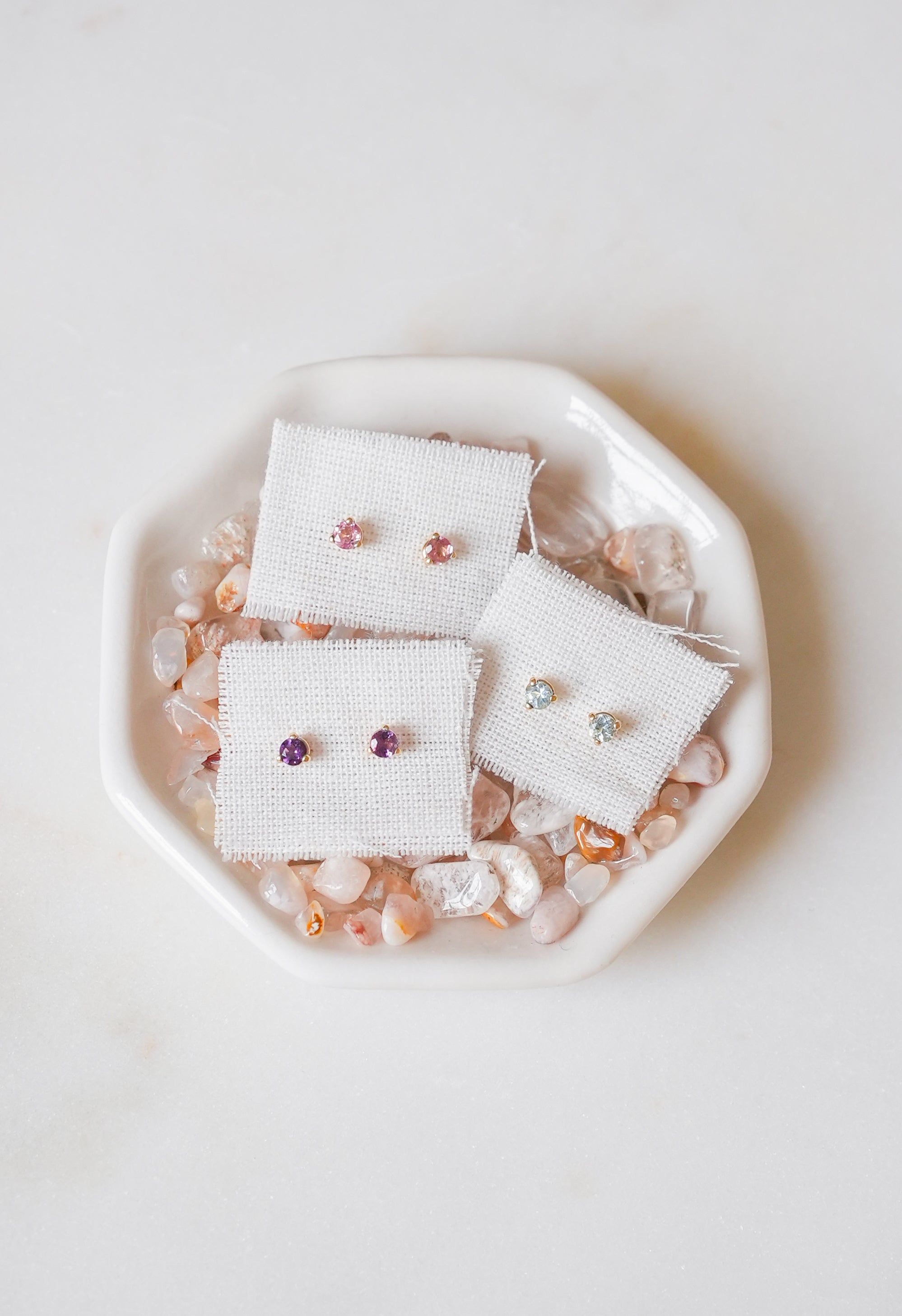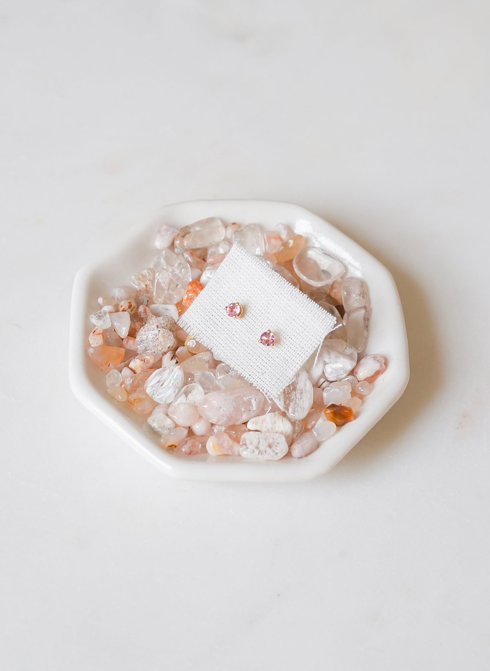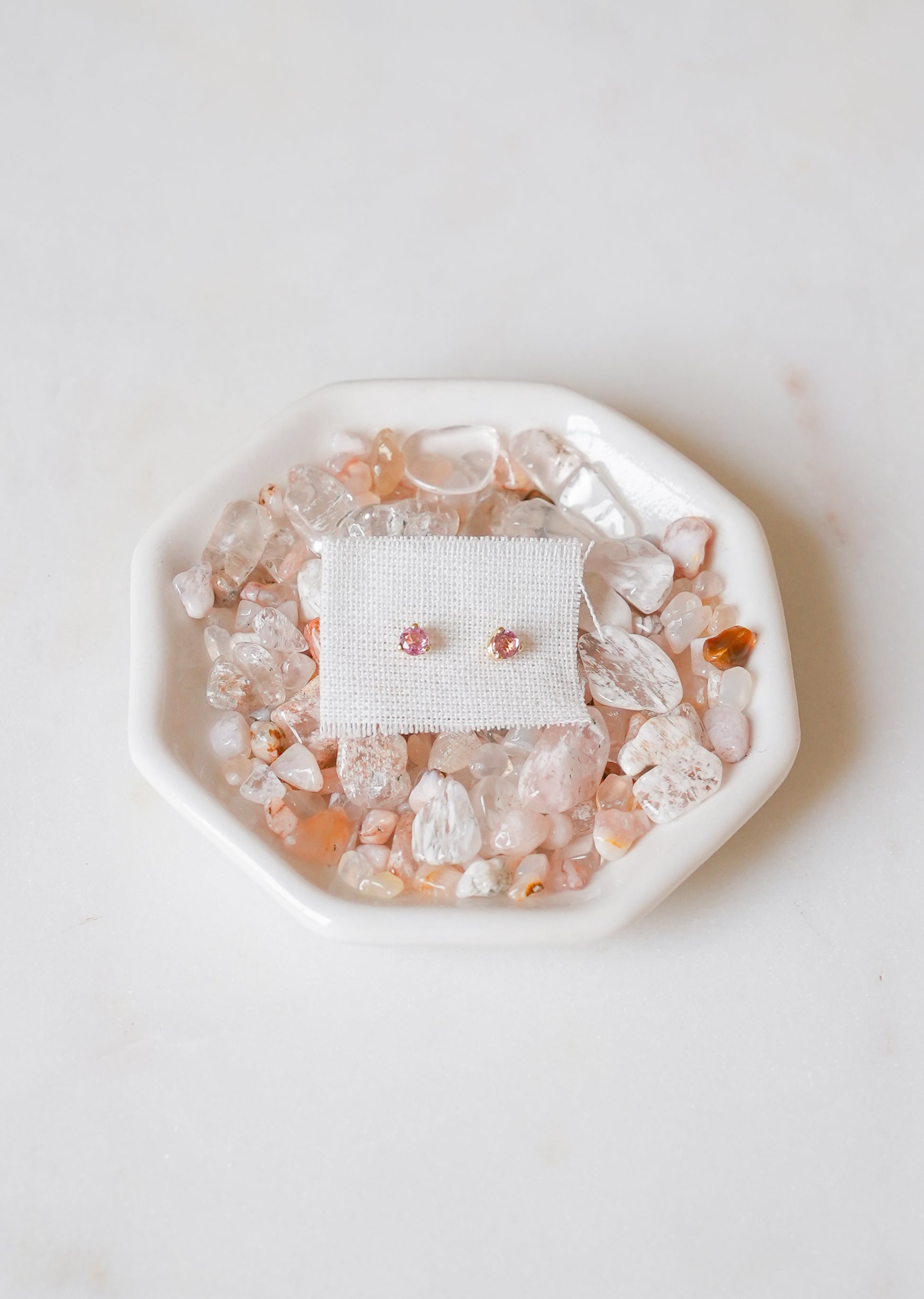 Hand selected in Tucson, these dainty solid gold studs feature a pair of perfectly pink tourmaline gemstones from Maine. Hand crafted for District Mineral by local jeweler Rachel Pfeffer, they are the perfect petite ethical earring for any ear. Solid 14k gold with 3mm faceted tourmaline.