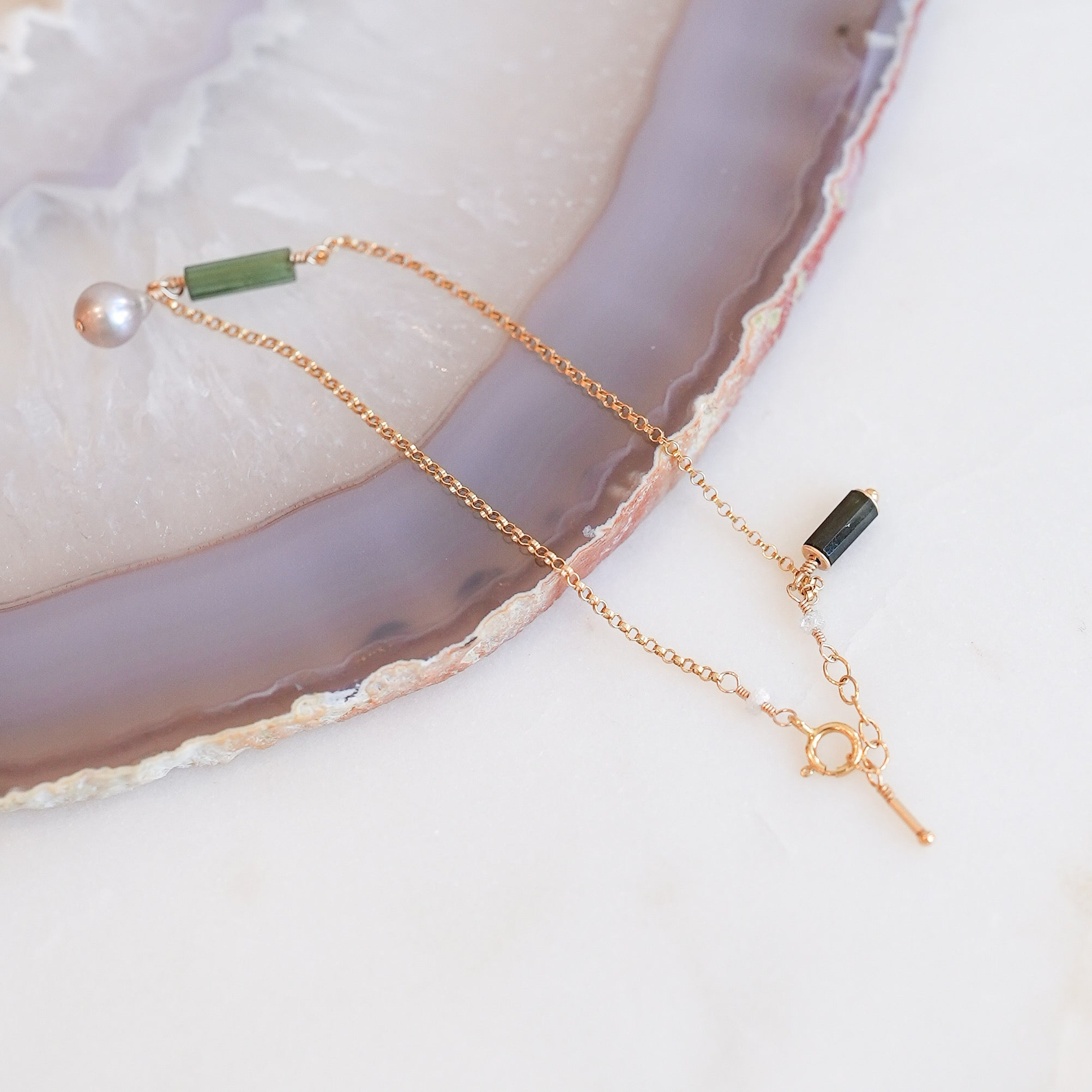 This delicate 14k gold-fill chain bracelet is adorned with a genuine green tourmaline and a metallic freshwater pearl at the center, while a deep black tourmaline charm and tiny beads adorn the clasp. Handmade by Turnstone Jewelry. Bracelet is roughly 7-7.25 inches.