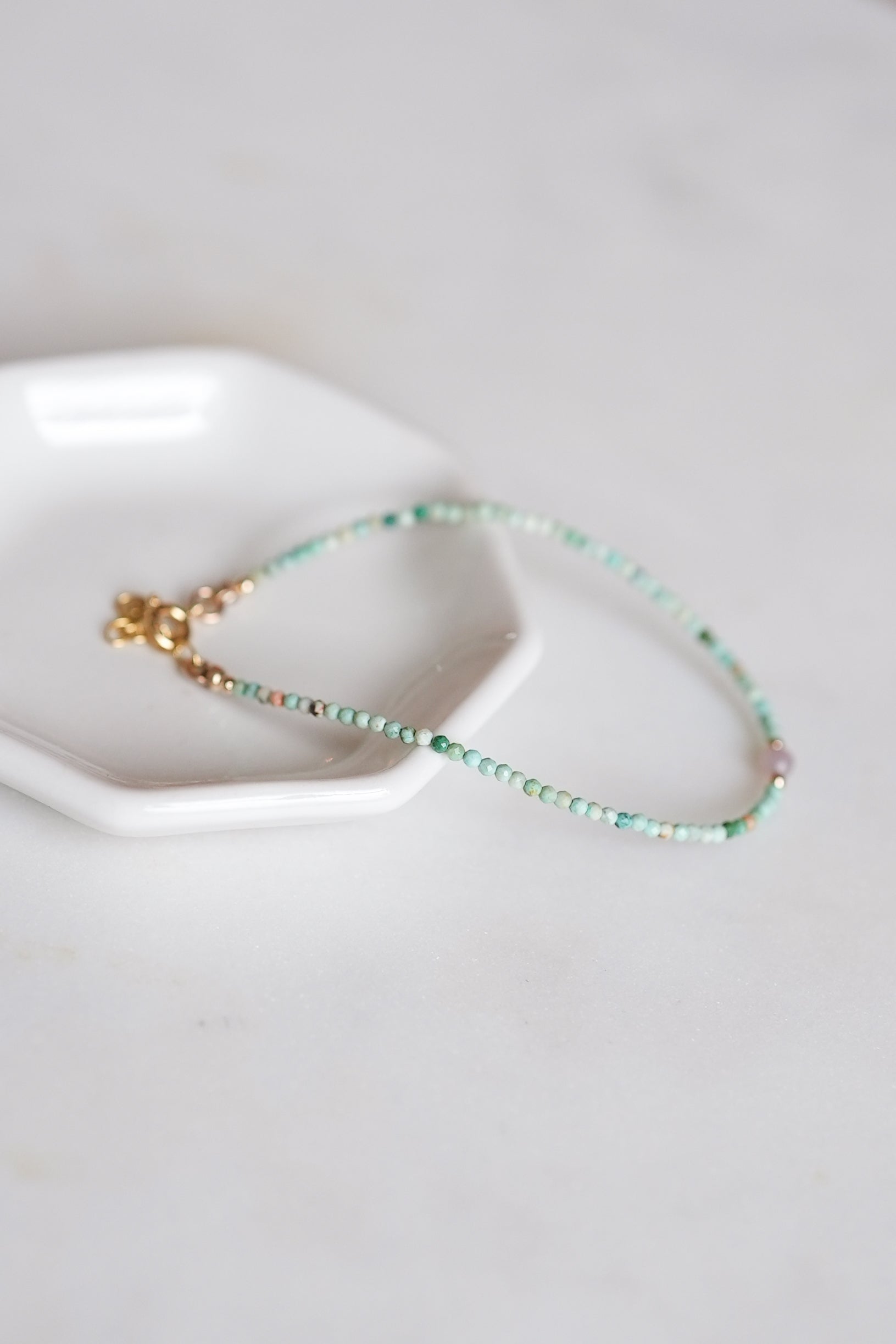 A delicate little dream! This pastel turquoise beaded bracelet features a petite rose quartz bead and 14k goldfill chain with extender. Hand crafted by Richmond, VA based Giant Lion.