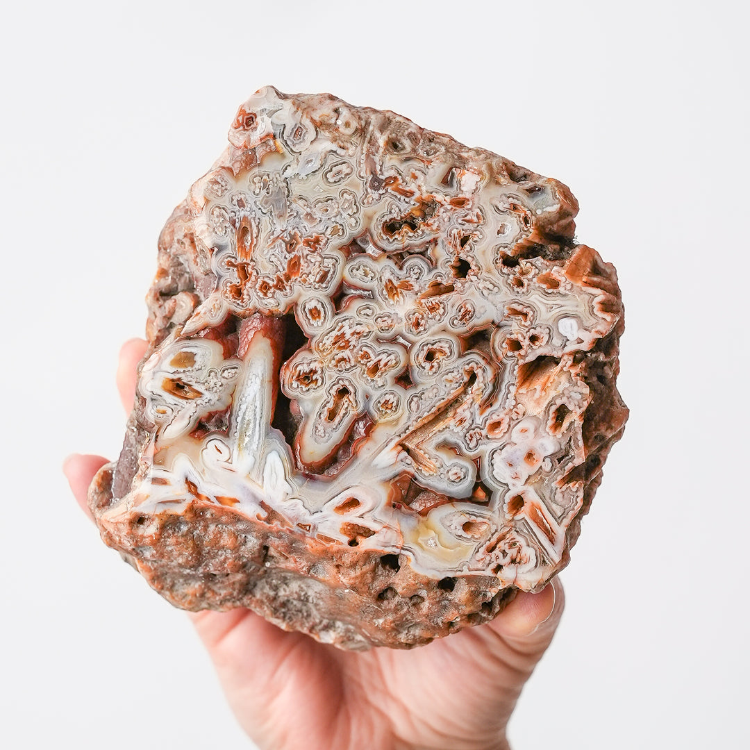 These citrines are a rich orange with vibrant and druzy white calcite clusters throughout. One has a cavernous interior with petite calcite florets and the other has a flatter face with larger calcite deposits.