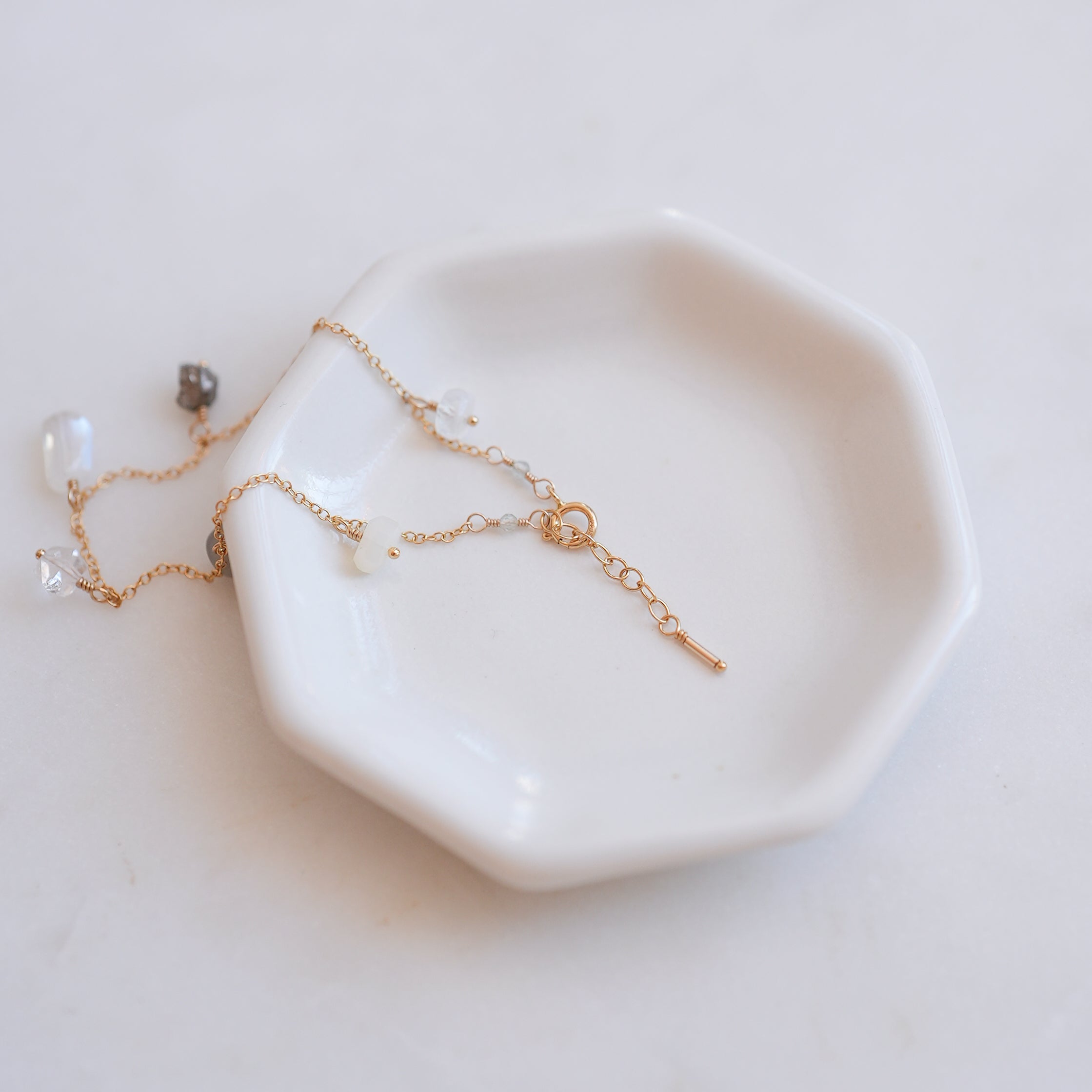 This bespoke, one of a kind of goldfill bracelet is bejeweled with delicate genuine gemstones. This beauty features moonstone, opal, aquamarine and more. Hand crafted mindfully by Turnstone Jewelry.