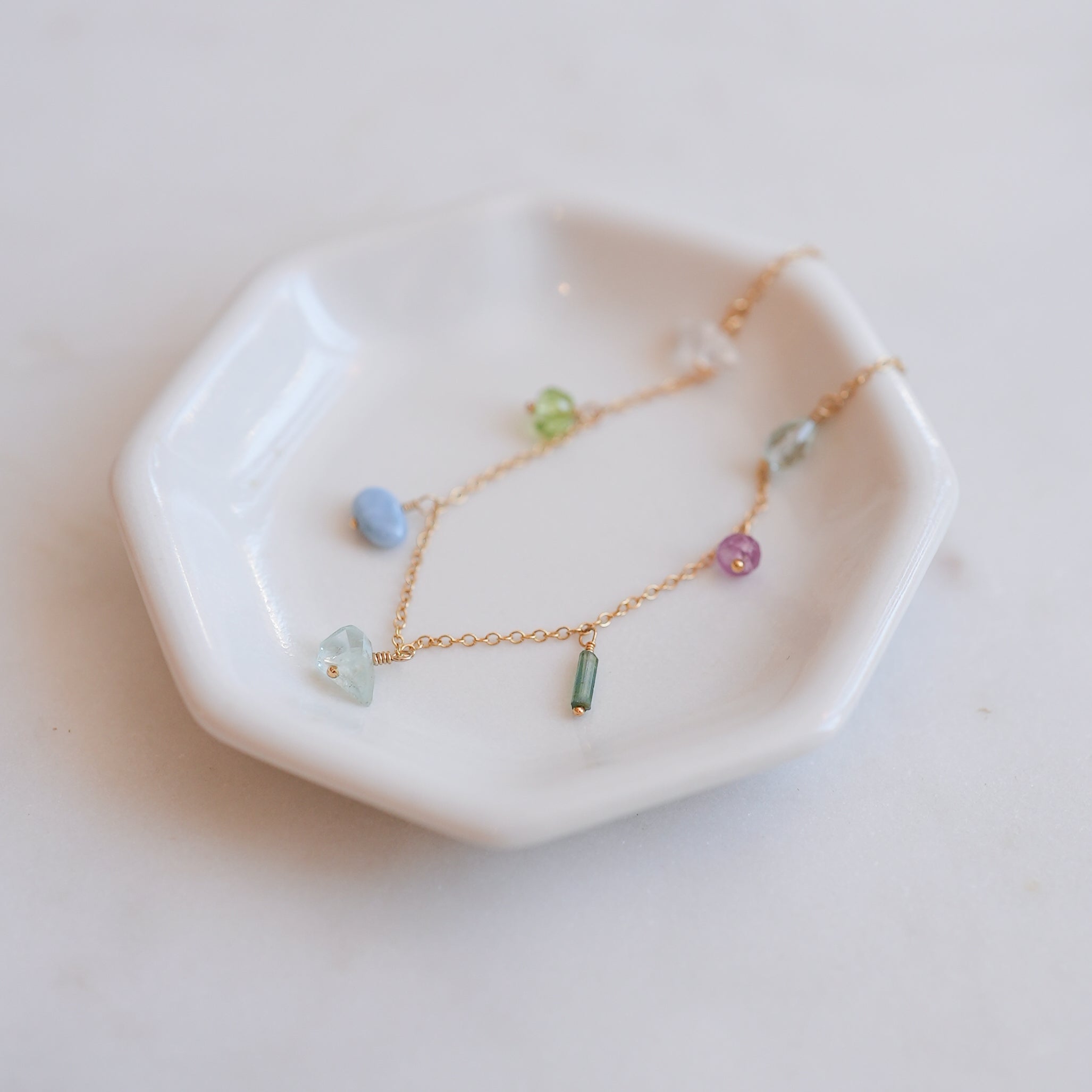 This bespoke, one of a kind of goldfill bracelet is bejeweled with delicate genuine gemstones. This beauty features peridot, blue opal, tourmaline, aquamarine and more. Hand crafted mindfully by Turnstone Jewelry.