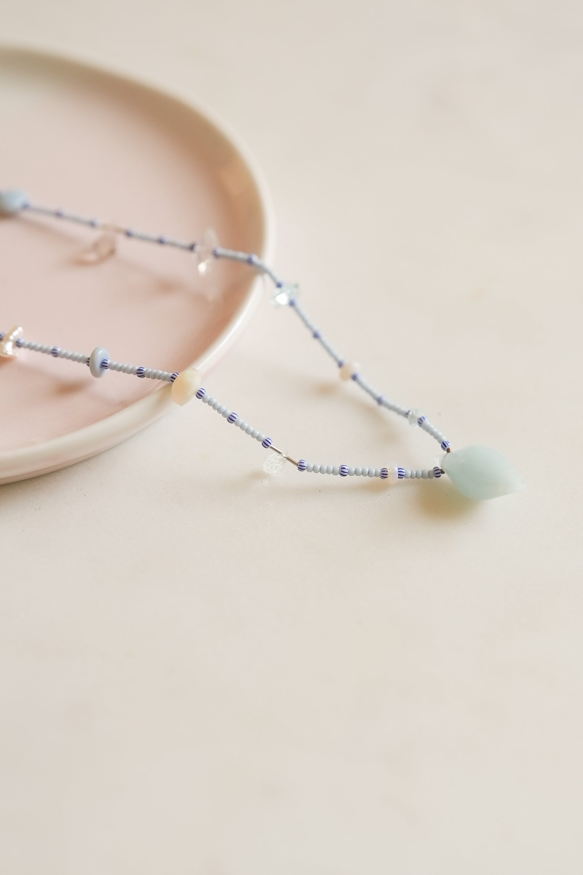 Each gem and bead are hand selected to balance and enhance the tranquil blue aquamarine at the center. Approximately 30" long, and featuring smoky quartz, blue opal, Ethiopian opal, pearl, vintage seed beads and more.
