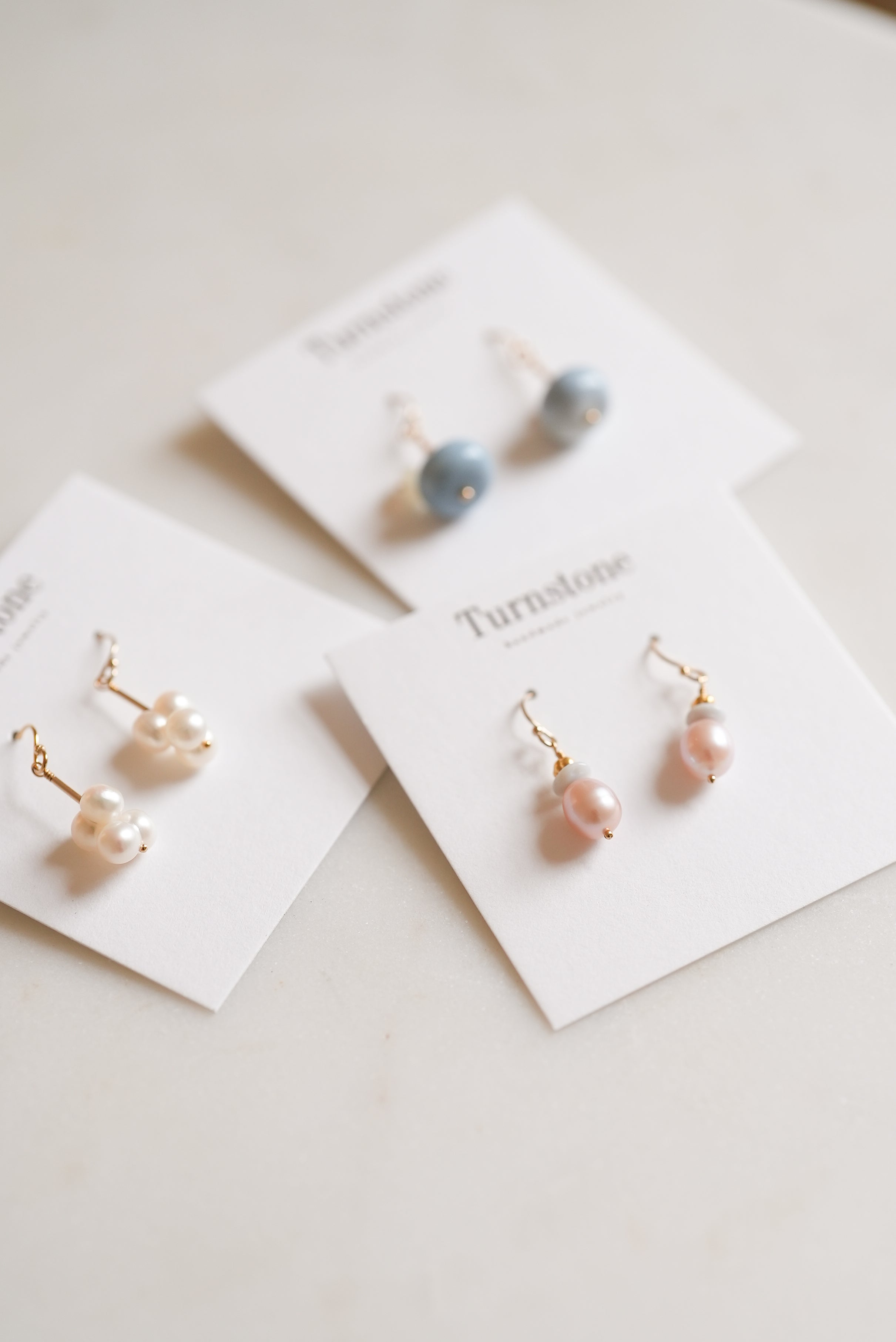 A one of a kind pair of double peanut pearl dangle earrings. Made with a goldfill post by local brand Turnstone Jewelry.