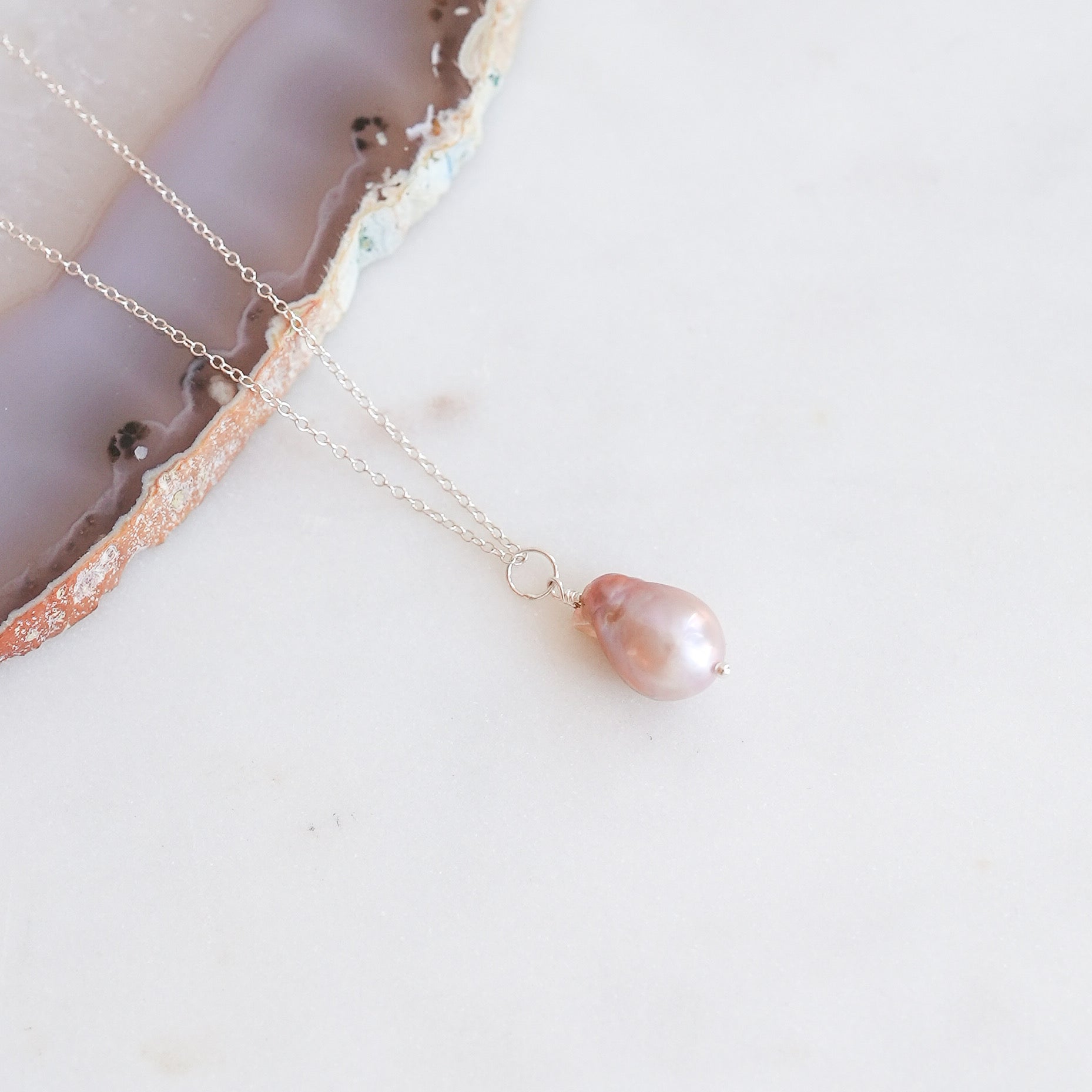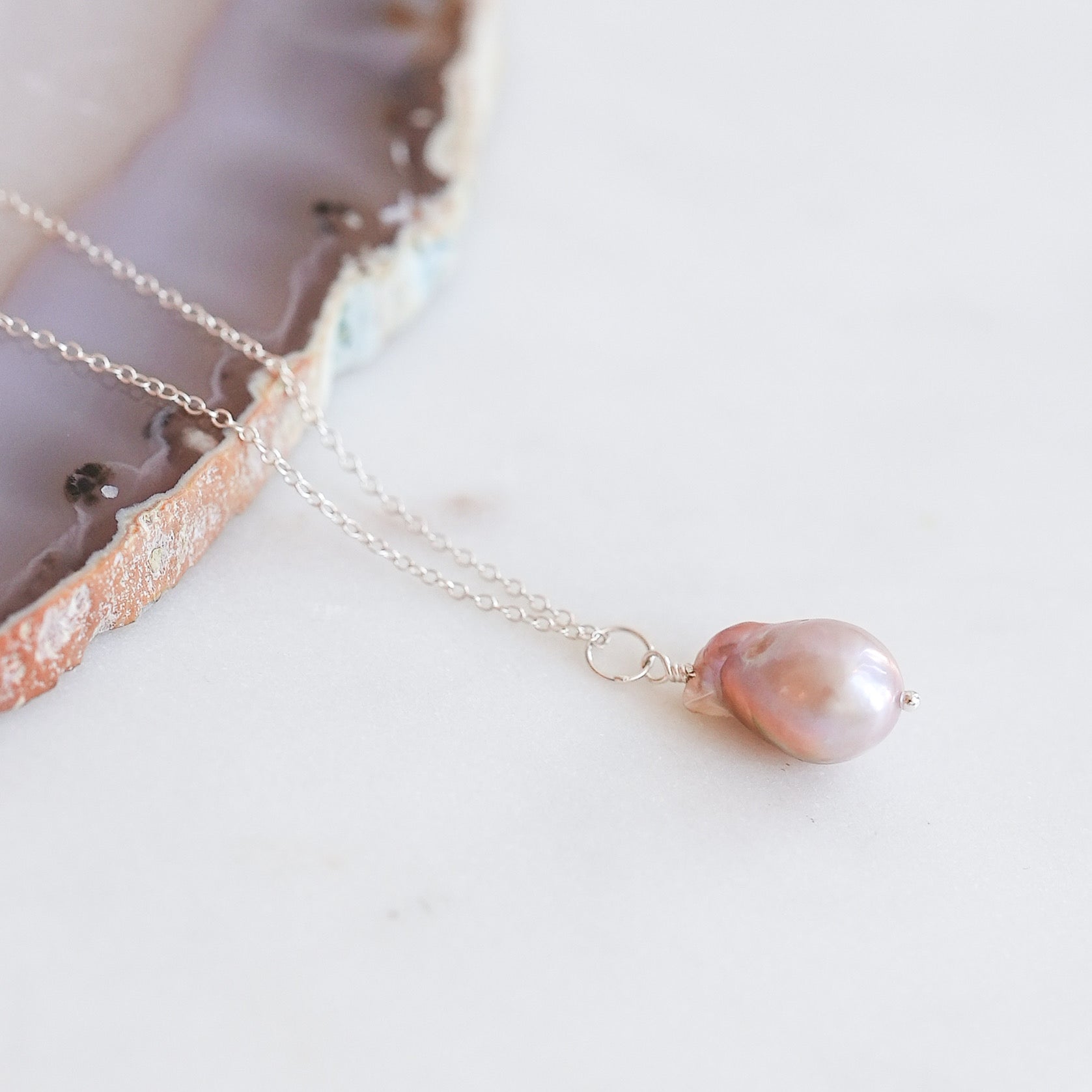 A beautiful blush freshwater pearl charm on an 18 inch sterling silver chain. Handmade by Turnstone Jewelry.