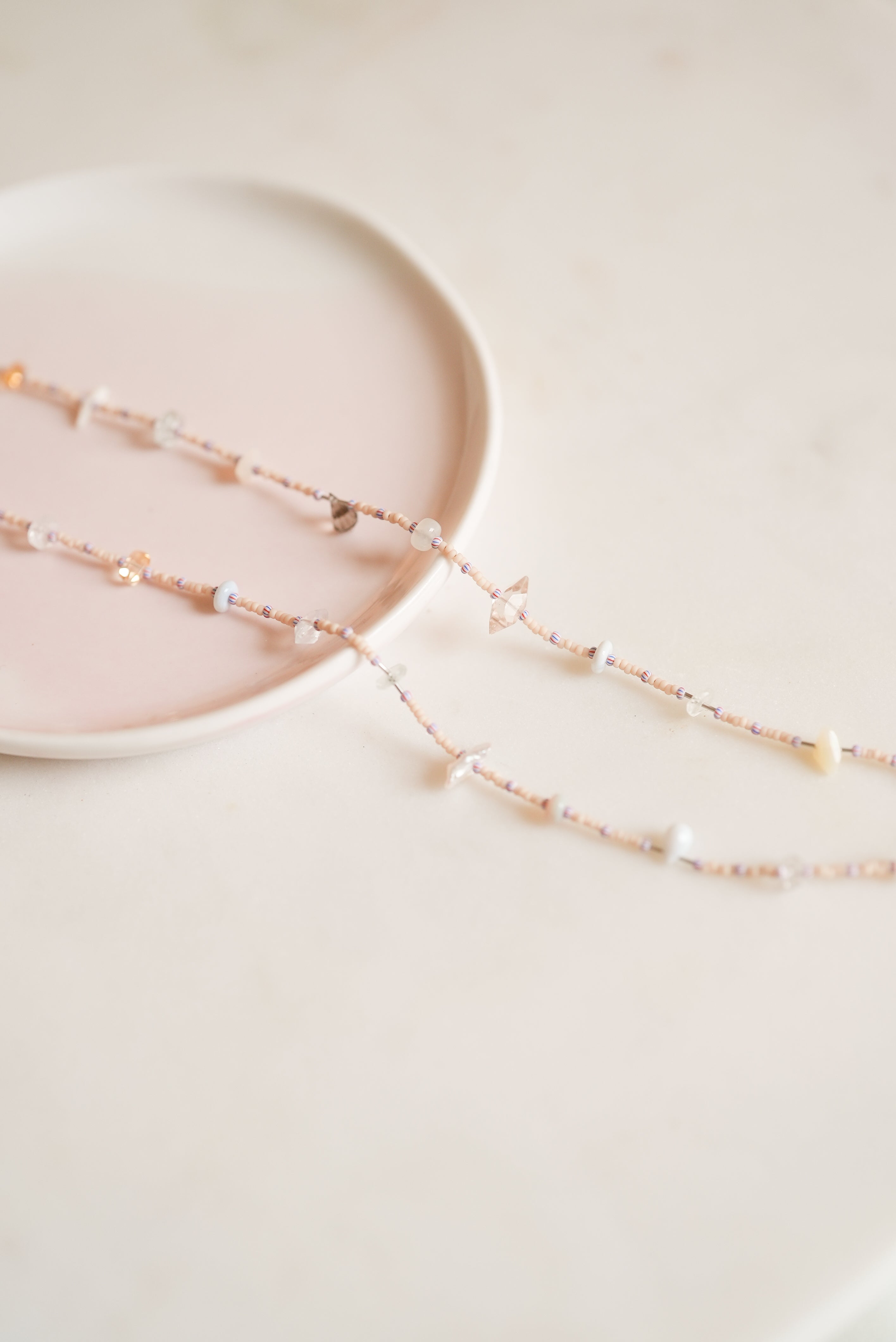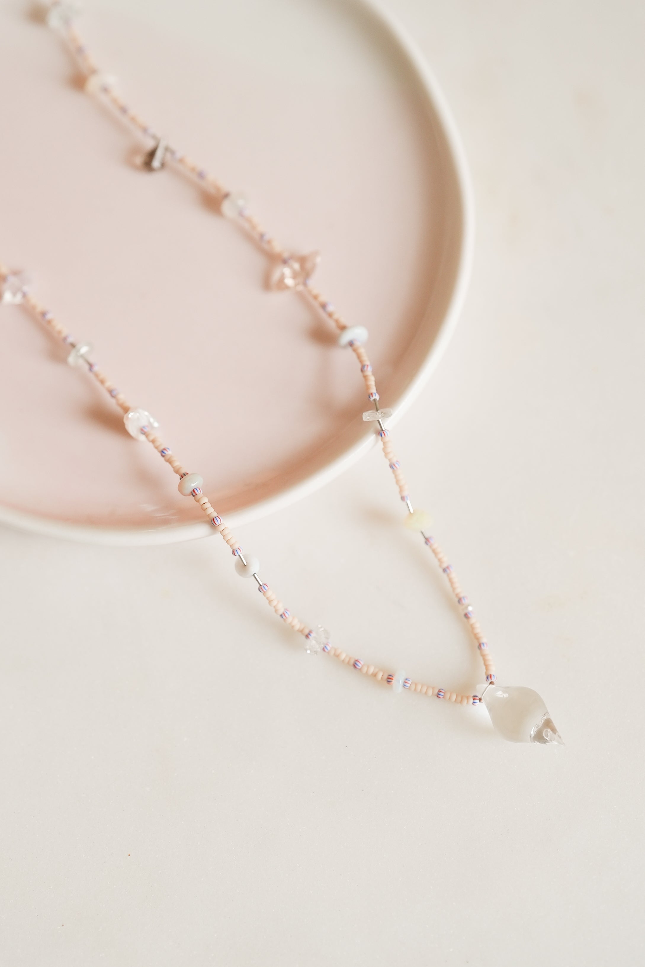 Clear Quartz Drop with Cream Seed Bead Long Necklace